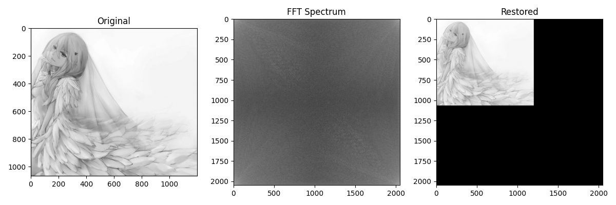- 实现了一维和二维 FFT 和 IFFT 函数- 添加了图像填充函数,以支持非 2 的整数次幂大小的图像 - 编写了主程序,演示了 FFT 和 IFFT 的使用方法 - 使用 Matplotlib 可视化了原始图像、频谱图和恢复后的图像